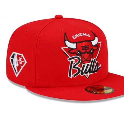 Fresh look for a fresh start. The Chicago Bulls Tip Off 59FIFTY Fitted Cap features a custom Bulls mark inspired by logos and wordmarks embroidered at the front panels with the Official NBA 75th anniversary logo embroidered at the right-wear side. Additional details include a team logo at the rear with a gray undervisor.