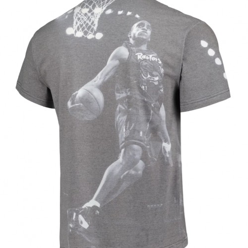 The Mitchell & Ness Vince Carter Above The Rim T-shirt is a must-have for any true Toronto Raptors fan. This heather gray tee features sublimated graphics that pay homage to the iconic Vince Carter dunk, while the woven jock tag at the hem adds authenticity. Made from a comfortable cotton and polyester blend, this t-shirt is perfect for cheering on the Raptors at the game or showing support around town.
