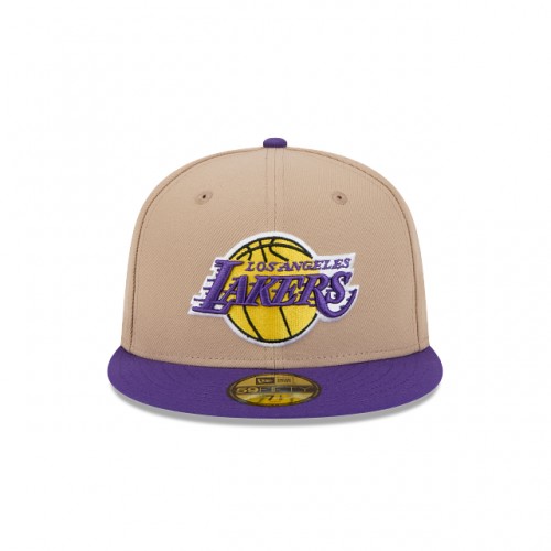 Upgrade your sporty look with the New Era Los Angeles Lakers 59FIFTY Fitted Hat. Made with a sleek camel color, this hat features the iconic Lakers logo and a structured fit for optimal comfort. Take your game to the next level with this must-have accessory.