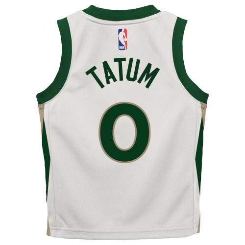 This Tatum Celtics City Edition Replica Jersey by Nike features a green design on white material with gold accents. It comes in sizes BS, BM, and BL.