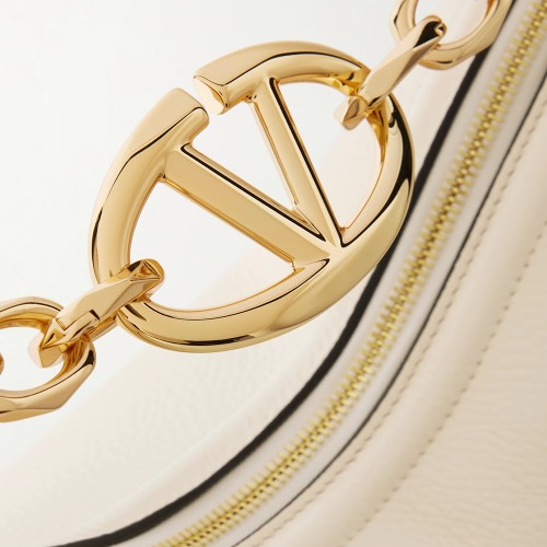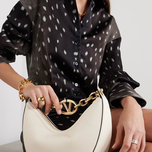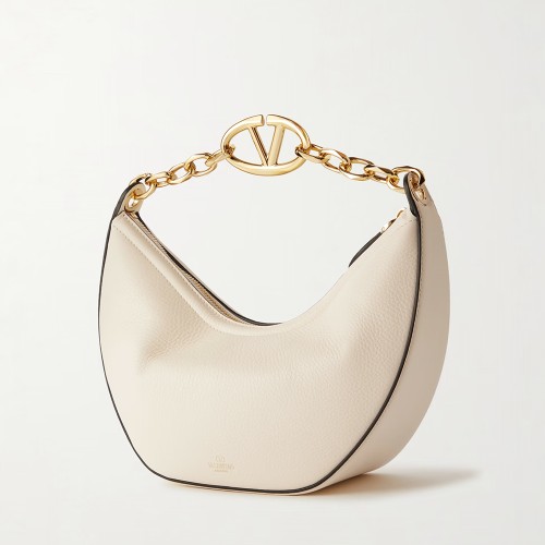 Details: Small Valentino Garavani VLogo Moon Bag hobo in garnet calfskin with chain detailed with a metallic VLogo Signature element. The bag can be worn on the shoulder/cross-body or in the hand thanks to the chain and removable leather shoulder strap.